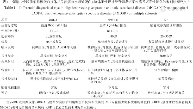 髓鞘少突胶质细胞糖蛋白抗体相关疾病与水通道蛋白4抗体阳性视神经脊髓炎谱系疾病及多发性硬化的鉴别诊断要点[15]