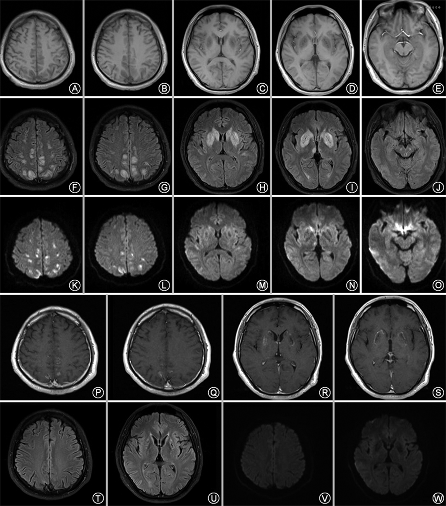 患者据基因结果及临床表型确诊为BTBGD,予口服丙戊酸钠缓释片、生物素、维生素B1、甲钴胺、叶酸治疗,患者无肢体抽搐发作,四肢肌力明显改善。出院后继续口服上述药物治疗。随访:3个月后复查维生素B12 730 pmol/L,叶酸 41.50 nmol/L,同型半胱氨酸、肌酶谱在正常范围。复查头颅MRI:脑干、双侧尾状核、豆状核、丘脑、额颞顶叶、右侧枕叶皮质下异常信号消退(图1T~W)。5个月后患者出现右脚趾不自主跖曲,不能奔跑,复查头颅MRI结果与3个月时无明显变化,脑电图在正常范围,考虑存在肌张力障碍症状,加用多巴丝肼片+普拉克索+巴氯芬口服后,症状缓解。