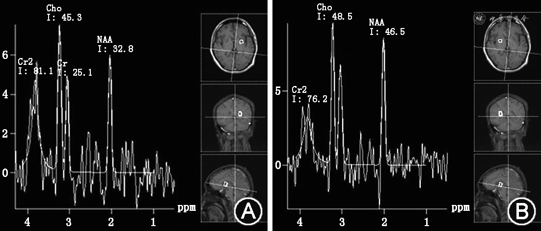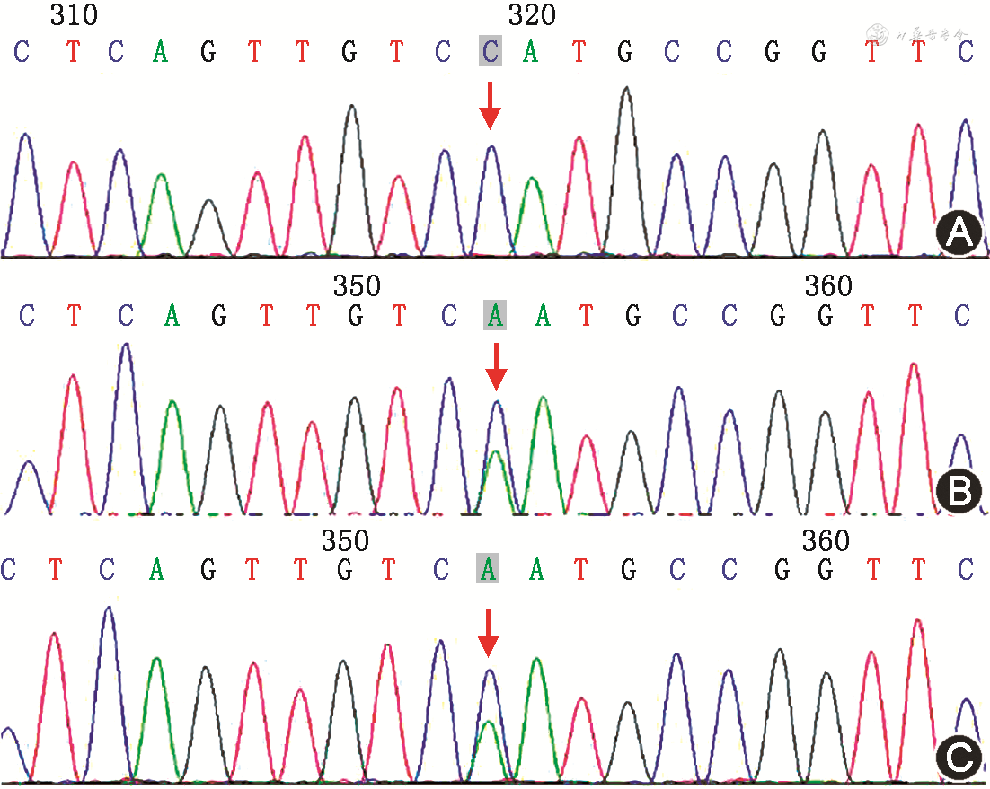 患者男性,29岁,因“发作性肢体抽搐3 d”于2019年12月13日于南京医科大学附属无锡人民医院神经内科住院。患者于3 d前出现左上肢抽搐,持续数十秒,伴左手麻木无力;2 d前出现右上肢抽搐2次,每次持续1 min左右,在当地医院就诊过程中出现发作性意识丧失,双眼向右凝视,牙关紧闭,四肢抽搐2次,每次持续1 min左右缓解。头颅CT:双侧基底节区可疑稍低密度影;头颅CTA:大血管未见明显狭窄。发病以来无感染、发热,无外伤、疫苗接种史,体重无明显下降。既往病史:7岁时有症状性癫痫、昏迷病史,当时考虑疑似脑干脑炎。父母体健,为姨兄妹近亲结婚,母亲有1次无明显原因流产史。体格检查:生命体征平稳,头发稀疏,色偏黄,其他内科体格检查未见明显异常。神经系统体格检查:意识清楚,双侧眼球向内、向上、向下活动受限,双眼水平眼震,右侧鼻唇沟浅,四肢肌力Ⅳ级,四肢肌张力、腱反射、深浅感觉正常,双侧指鼻试验不准,双侧跟膝胫试验不准,双侧病理征、脑膜刺激征阴性。辅助检查:(1)实验室检查:天冬氨酸氨基转移酶107 U/L(正常值15~40 U/L),丙氨酸氨基转移酶40 U/L(正常值9~50 U/L),乳酸脱氢酶325 U/L(正常值120~250 U/L),肌酸激酶8 498 U/L(正常值50~310 U/L),肌酸激酶-MB同工酶17.9 U/L(正常值0~12 U/L),风疹病毒抗体-IgG 15.50 IU/ml(正常值0~10 IU/ml),维生素B12 75 pmol/L(正常值133~675 pmol/L),叶酸 4.09 nmol/L(正常值7.0~45.1 nmol/L),同型半胱氨酸 33.40 μmol/L(正常值4.0~15.4 μmol/L),风湿免疫指标、肿瘤指标、甲状腺功能及相关抗体、铜蓝蛋白、血乳酸、血气分析结果均在正常范围。(2)腰椎穿刺:测压正常,脑脊液常规、生化、病原学检查、免疫球蛋白水平均在正常范围。(3)尿液有机酸分析:甲基丙二酸正常。(4)腹部超声、心脏超声、肌电图检查未见明显异常;动态脑电图:尚在正常范围内(基本节律以低幅β波为主)。(5)头颅MRI:脑干、双侧尾状核、豆状核、丘脑、额颞顶叶、右侧枕叶皮质下异常信号,呈T1低信号(图1A~E)、液体衰减反转恢复序列(FLAIR)高信号(图1F~J),部分弥散加权成像(DWI)高信号(图1K~O);增强头颅MRI:增强后双侧额顶皮质部分病灶可见斑片状强化,双侧基底节区病灶可见结节状及环状强化(图1P~S);磁共振波谱:基底节感兴趣区胆碱峰轻度升高,N-乙酰天冬氨酸峰轻度减低,未见脂质峰或乳酸峰(图2)。(6)基因检测:经知情同意后抽取患者及其父母外周静脉血3 ml,应用二代目标区域捕获测序与Sanger测序验证发现SLC19A3基因的NM_025243:C.1066A>C纯合变异(图3A),其父母该位点均为杂合变异(图3B、C),该变异发生在第4号外显子区,使得第356位的天冬酰胺变异为组氨酸。应用PolyPhen-2预测该变异,结果为致病性的,MutationTaster、SIFT、LR、RialSVM等预测该变异为良性的或可耐受的,目前未见该变异在相关文献或数据库中的报道。