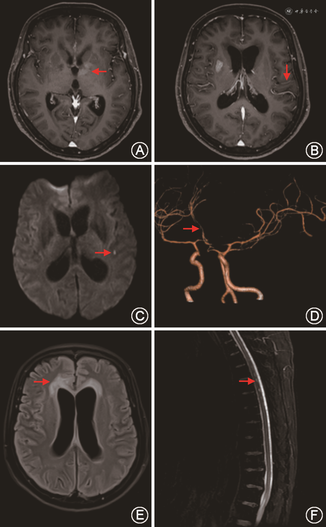 胸部X线或胸部CT检查可提示存在活动性或陈旧性结核感染证据。头颅CT、MRI增强扫描可显示颅底基底池、外侧裂及脑干周围脑膜呈不规则条状、结节状强化[9]。脑实质内可见散在的粟粒状等密度或稍高密度小结节。脑内结核瘤增强扫描可见环形、靶形或不规则的团块阴影。早期可见脑室缩小等脑水肿征象,晚期可见脑室普遍性扩大等脑积水征象。头颅MRI DWI可显示合并脑梗死的影像学改变[9]。头颅CTA、MRA可显示颈内动脉远端及大脑前、中动脉近端血管狭窄。见图1。