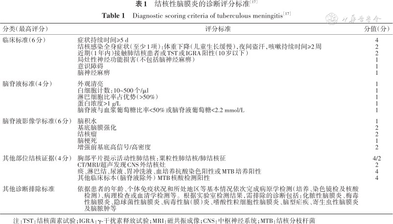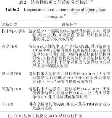 目前诊断的国际标准,仍然参考2010国际专家共识[17],对TBM的诊断建议详见表1,2。