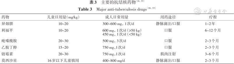 1.异烟肼:异烟肼可抑制MTB的DNA合成,破坏菌体内酶活性,干扰分枝菌酸合成,对细胞内、外MTB均有杀灭作用,易于透过血脑屏障[34]。不良反应主要为周围神经炎、肝功能损害,偶尔可致癫痫发作。异烟肼治疗期间应定期监测肝功能。