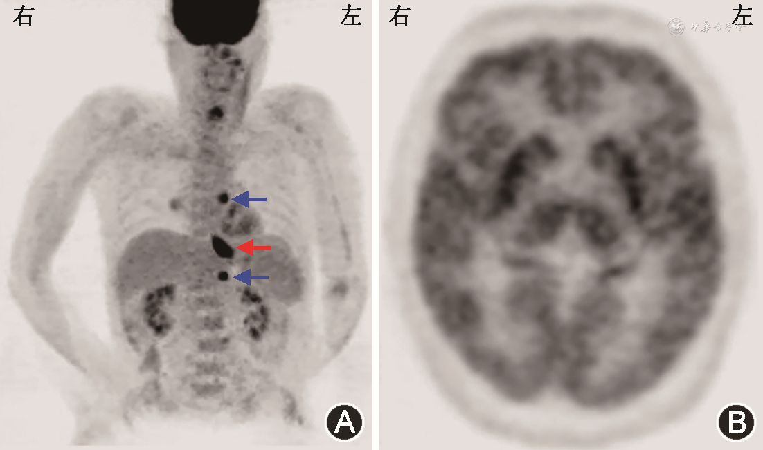 抗两性蛋白抗体阳性患者约80%合并恶性肿瘤,主要为小细胞肺癌和乳腺癌。既往报道的其他合并肿瘤还包括黑色素瘤、非小细胞肺癌、胃癌、食管癌、卵巢癌和宫颈癌,但均仅有1、2例患者的报道[2,8]。我科在2016年曾对13例抗两性蛋白抗体相关副肿瘤神经综合征患者的总结发现,共6例患者存在恶性肿瘤,其中5例为小细胞肺癌,1例为乳腺癌。食管小细胞性神经内分泌癌是一种罕见肿瘤,约占食管恶性肿瘤的0.5%~2.8%[9]。我们仅检索到1例抗两性蛋白抗体阳性患者合并食管癌的报道,其具体病理类型不详[2]。抗Hu抗体相关副肿瘤神经综合征患者中曾有食管小细胞癌的病例报道[10, 11]。本例患者胸、腹及盆腔CT并未发现肿瘤,胃镜下亦未见典型的肿瘤病灶,FDG-PET对其肿瘤的发现、活检定位均起到了重要作用。在神经内分泌肿瘤的病理诊断中,常用的反映神经内分泌和神经分化的标志物包括突触素(synaptophysin)、嗜铬粒蛋白和CD56。Ki-67标记指数则在神经内分泌肿瘤的分级中起重要作用,Ki-67指数>20%提示高级别肿瘤。本例患者病理HE染色见异型小蓝圆细胞浸润,免疫组织化学突触素部分阳性,CD56阳性,Ki-67指数90%,符合神经内分泌癌(小细胞性)诊断。考虑肺外小细胞癌与小细胞肺癌病理学上的一致性,符合2021年PNS诊断标准中与抗体一致的肿瘤[3]。