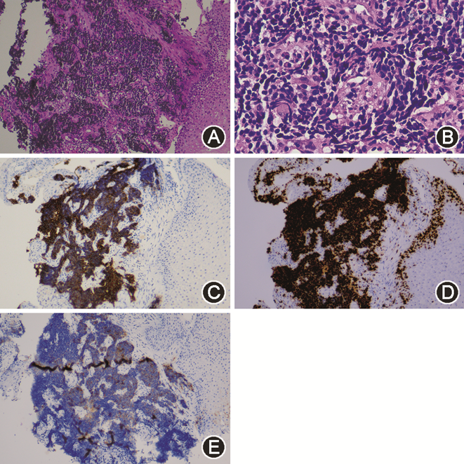 患者入院后完善胸、腹及盆腔CT平扫未见肿瘤性病变。复查腰椎穿刺(表1),脑脊液炎性反应较半个月前明显减轻;血及脑脊液抗两性蛋白抗体阳性,血及脑脊液抗CV2/CRMP5、Ma2、Hu、Yo、Ri抗体均阴性。9月1日行氟脱氧葡萄糖正电子发射体层摄影(FDG-PET;图1)示食管下段近贲门代谢增高灶,范围约2.7 cm × 2.1 cm,最大标准化摄取值(maximum standardized uptake value,SUVmax)14.1,恶性病变可能性大,伴T7水平食管左旁、肝胃间隙、上腹部腹膜后淋巴结转移,最大者短径约0.8 cm,SUVmax 7.3,建议行胃镜检查明确病理;双侧枕叶及小脑代谢减低,双侧颞叶内侧代谢不均匀稍增高,双侧基底节及丘脑代谢增高,脑干代谢不均匀稍增高,符合自身免疫性脑炎表现。9月9日胃镜(图2)示食管下段近贲门处后壁侧小孔样改变,局部无脓液溢出、黏膜稍充血、窄带成像下尚可,取活组织检查(活检)组织1块,质软。病理回报(图3)食管下段黏膜下见小团异型小蓝圆细胞浸润,结合免疫组织化学检查结果,符合神经内分泌癌(小细胞性)。