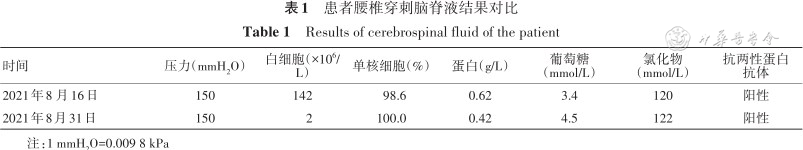 患者出院时意识状态较入院时明显好转,夜间间断喊叫、躁动。体格检查:卧床,意识尚清楚,格拉斯哥量表评分睁眼反应4分、语言反应3分、肢体运动6分,左右注视见双眼水平眼震,四肢自主活动可,肌力近Ⅴ级,余神经系统体格检查基本同入院。2022年2月21日电话随访,患者已从当地医院出院返回家中,目前对症支持为主,已拔除胃管,可经口进食酸奶等半流食,无明显呕吐。患者卧床,间断发热,白天可间断睁眼,仍较躁动,言语含混不清。