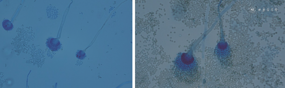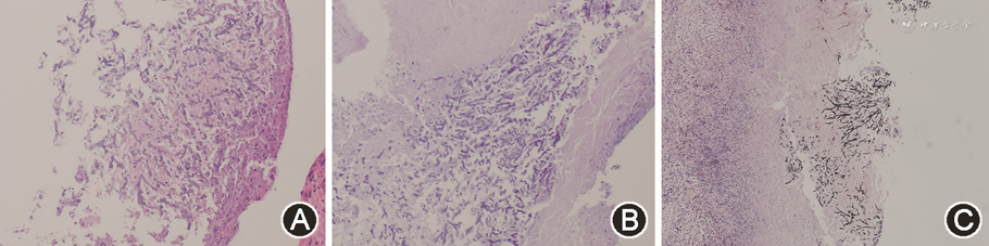 出院后患者未有抽搐发作,2021年12月复查头颅MRI示:左侧额叶靶形T1低信号、T2高信号,增强后环形强化,周围多发大片状T1低信号、T2高信号(图1B)。考虑颅内病灶为脓肿可能,再次收入病房,完善原发病评估:血常规、血肌酐无明显异常,血清白蛋白23 g/L,24 h尿蛋白4.49 g;抗SSA、抗Ro52抗体阳性,IgG 5.87 g/L,C3、C4正常。血清(1,3)-β-D葡聚糖试验(G试验)、半乳甘露聚糖试验(GM试验)均阴性。腰椎穿刺脑脊液压力为175 mmH2O,脑脊液常规、生化、细胞学、细菌、真菌涂片培养及脑脊液第二代测序(next-generation sequencing,NGS)均为阴性。PET/CT:左额叶白质区囊性结节,仅囊壁有轻度代谢活性,最大标准摄取值7.7,伴周围大片水肿。治疗上继续予泼尼松、羟氯喹、左乙拉西坦,加以罗氏芬2 g 1次/12 h静脉点滴17 d,复查头颅增强MRI未见变化(图1C)。多学科会诊建议开颅行手术切除活组织检查(活检),术前抗感染改为美罗培南2 g 1次/8 h+万古霉素1 g 1次/12 h。2022年1月25日全身麻醉后行神经导航下左额叶脓肿切除术,组织培养提示烟曲霉菌(图2,3),NGS回报烟曲霉菌、细环病毒、人类疱疹病毒5型,病理检查(图4)示:坏死物、真菌(曲菌)菌丝及肉芽组织,周边极少许水肿的神经组织。特染结果:过碘酸雪夫染色(periodic acid-Schiff staining)阳性,六胺银染色阳性。抗感染方案遂改为伏立康唑0.2 g 1次/12 h联合美罗培南2 g 1次/8 h。患者未再出现发热及神经系统症状,原发病好转后于2022年2月24日出院。出院后继续口服伏立康唑片0.2 g 1次/12 h,于2022年3月21日及2022年4月4日规律复诊,诉无癫痫再发,复查MRI示术后改变,术区类圆形信号影呈缩小趋势,边缘少许强化,未见环形强化(图1D、E)。患者已于2022年8月20停用伏立康唑。