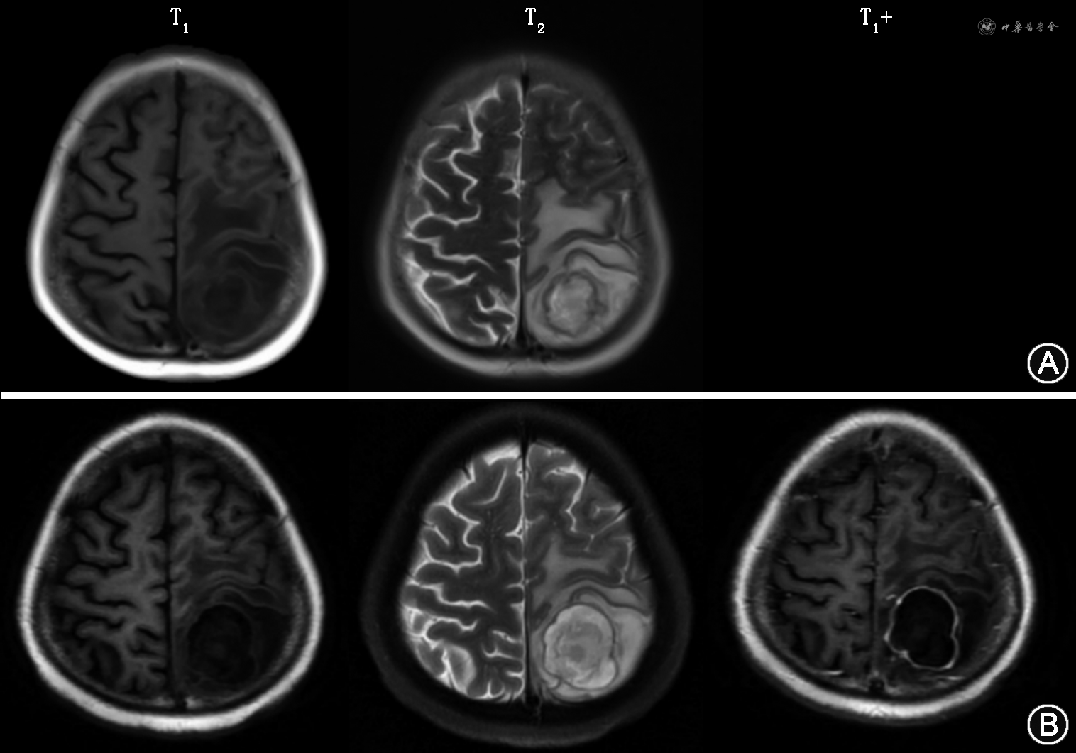 例2 患者男性,20岁,主因皮疹、双下肢水肿9年余,间断发热、抽搐3个月余入院。2011年患者出现面部红斑,伴发热、乏力,抗核抗体、抗组蛋白抗体、抗核小体抗体、抗双链DNA抗体、抗SSA抗体、抗SSB抗体均阳性,大量蛋白尿、低补体血症,肾活检示狼疮性肾炎Ⅴ型,考虑“系统性红斑狼疮,狼疮性肾炎”,予甲泼尼龙冲击,序贯泼尼松35 mg 1次/d、霉酚酸酯1 g 1次/d,激素规律减量,治疗约2年。此后病情数次波动,予足量激素联合免疫抑制剂治疗有效。2021年3月21日患者出现高热,最高体温39.4 ℃,右侧上下肢抖动,发展至全身抽搐、牙关紧闭、意识丧失,持续约30 min后自行缓解,急诊予甲泼尼龙40 mg×5 d及对症处理后好转。2021年6月9日患者再次出现发热、头痛、抽搐,体格检查发现库欣面容,颈软,无抵抗,双下肢膝腱反射活跃,病理征阳性。头颅MRI提示左侧顶枕叶占位,环形强化,伴周围大片水肿带(图5A)。考虑SLE诊断明确,合并颅内感染可能,收入北京协和医院肾内科病房。完善原发病相关评估:血常规无明显异常,血清白蛋白25 g/L,血肌酐212 μmol/L,24 h尿蛋白5.01 g,红细胞沉降率103 mm/h,超敏C反应蛋白11.38 mg/L,抗核抗体滴度1∶80,斑点型,IgG 4.82 g/L。查血清G、GM试验均阴性。腰椎穿刺脑脊液压力235 mmH2O,脑脊液蛋白0.46 g/L,脑脊液白细胞计数10×106/L,脑脊液单核细胞计数2×106/L,培养、涂片均阴性,脑脊液NGS报日本马拉色菌及溶血葡萄球菌,考虑污染可能。在治疗方面,对原发病予暂停免疫抑制剂,泼尼松减量,颅内病灶予美罗培南2 g 1次/12 h×14 d经验性抗感染、降颅压、抗癫痫治疗,复查颅内增强MRI示占位较前增大,环形强化明显(图5B)。为明确颅内感染病原,患者于2021年7月12日行神经导航下脑脓肿外引流术,缓慢抽取脓液约7 ml送检,脓液NGS回报烟曲霉菌,真菌涂片可见较多真菌丝,真菌培养发现烟曲霉菌。术后予以伏立康唑200 mg 1次/12 h治疗,监测患者体温逐渐恢复正常,原发病控制稳定后出院。出院后继续口服伏立康唑200 mg 1次/12 h,2021年10月22日线上复诊,外院复查核磁示病灶明显缩小,目前继续伏立康唑治疗中。