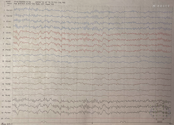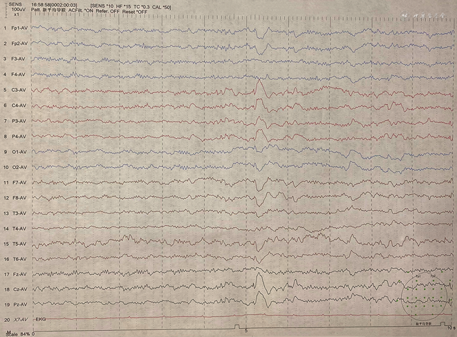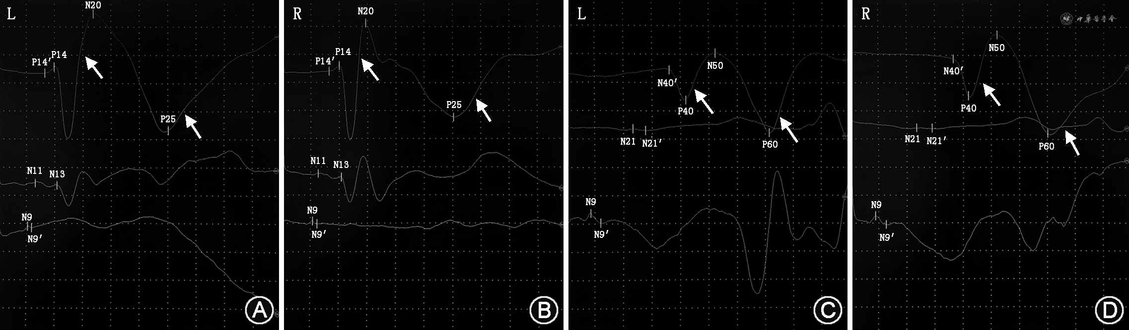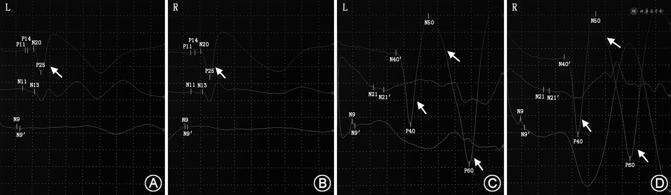实验室检查:血、尿、粪便常规,肝、肾功能,血脂、血糖以及电解质、甲状腺功能均无明显异常。脑电图:用药前24 h动态脑电图(2020年11月15日,于外院检测故具体图像未提供)示监测期间可见多量低中幅尖波发放,以左侧中央区、顶区、前、中颞区为著;用药后视频脑电图(2022年5月11日)示正常青少年视频脑电监测(图1)。头颅MRI未见明显异常(图2A、B)。外院肌电图(2020年10月15日)示右胫后神经F波未引出;左胫后神经F波潜伏期正常,波幅降低,出现率100%;双正中神经F波潜伏期均正常,波幅均降低,出现率100%。我院肌电图(2022年5月11日)示左正中神经F波潜伏期正常,波幅降低,出现率100%,双胫后神经F波均未引出。交感皮肤反应(sympathetic skin reaction,SSR):刺激左正中神经,于双手、双足记录,双手、双足SSR均未见肯定波形。体感诱发电位(somatosensory evoked potentials,SEP;2022年5月11日):双上肢方波分别刺激左、右正中神经,双侧Erb电位(N9)各波潜伏期及波幅均正常,波形分化及可重复性均可,双侧颈髓电位(N13)潜伏期均延长,波幅均正常,波形分化及可重复性均可,双侧皮质电位(P15、N20、P25)各波潜伏期均延长,波幅明显增高(巨大电位),波形分化及可重复性均可;双下肢方波分别刺激左、右胫后神经,双侧皮质电位(P40、N50、P60)各波潜伏期均延长,波幅明显增高(巨大电位),波形分化及可重复性均可(图3)。视觉诱发电位(visual evoked potentials,VEP;2022年5月11日):闪光刺激左眼,枕记录,左眼VEP P100多次重复刺激均未见肯定波形;闪光刺激右眼,枕记录,右眼VEP P100多次重复刺激均未见肯定波形。脑干听觉诱发电位:双耳正常。眼科检查见双眼眼底黄斑区存在樱桃红斑(图4);光学相干断层成像示黄斑形态正常。