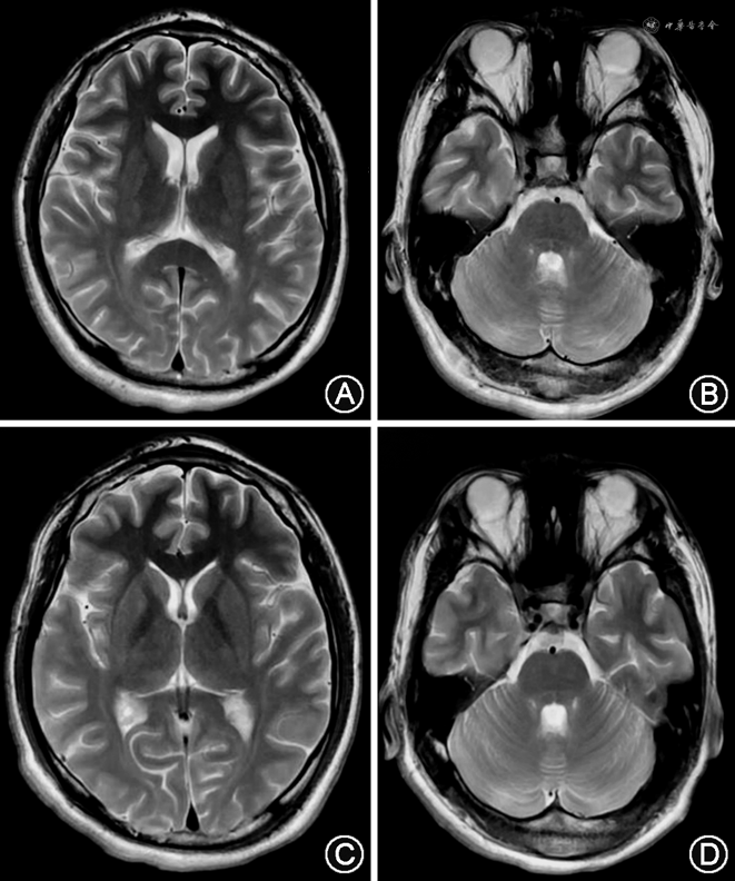 临床资料 例1患者为男性,16岁,因“间断性四肢不自主抖动2年,伴发作性意识丧失”于2021年3月31日就诊于宁夏医科大学总医院。患者于2年前逐渐出现四肢间断性不自主抖动,伴双下肢发软,双手抖动常于情绪激动或做随意运动时出现,接近目的物时抖动加重,写字等精细动作时较明显。双腿抖动伴发软于站立、行走时出现,迈步时加重。同期出现间断性言语不利,表现为语速减慢、言语断续、语音颤抖。于2020年8月熬夜次日午休起床后突发意识丧失,表现为四肢抽搐、双眼上翻、口吐白沫、牙关紧闭、憋气及颜面青紫,持续2~3 min后自行缓解。2020年10月患者于休息时无诱因再次发作,症状同前,发作前感四肢发软、无力,伴双手不自主抖动、语速减慢、声音颤抖。无智力、记忆力、计算力下降。于2020年就诊外院诊断为“隐源性癫痫?”,给予丙戊酸钠、奥卡西平治疗后,患者病情改善不明显,并于2021年3月出现四肢抖动加重,入院后将药物调整为左乙拉西坦0.5 g,2次/d,奥卡西平0.45 g,2次/d。服药期间随访,患者诉症状控制尚可,肢体抖动出现频率较前减少。2022年1月患者频繁出现癫痫发作,每天1~2次,每次持续2~3 min后自行缓解。此后四肢抖动进行性加重,目前站立、行走困难,搀扶平地行走距离小于50 m,日常需坐轮椅出行,于2022年5月11日再次入院,将药物调整为左乙拉西坦0.45 g,2次/d;奥卡西平0.15 g,2次/d;氯硝西泮1 mg,2次/d;拉考沙胺150 mg,2次/d。病程中,患者意识清楚,饮食、睡眠可,大小便正常,近期体重无明显增减。既往史及家族史:足月顺产,孕期胎动正常,羊水正常,出生时无缺氧史,1岁会说,6个月会坐,1岁半会走,14岁前精神运动发育均无明显异常。随访期间诉癫痫发作次数较前明显减少,四肢抖动症状较前缓解。