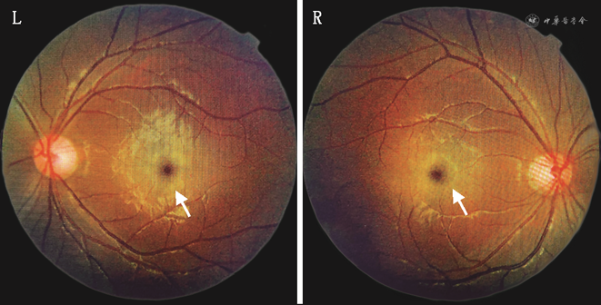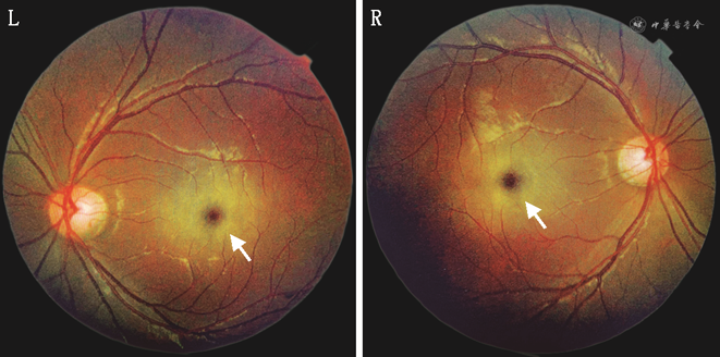 实验室检查:血、尿、粪便常规,肝、肾功能,血脂、血糖以及电解质、甲状腺功能均无明显异常。2021年2月1日动态脑电图示中度异常脑电图,醒睡各期双侧额、中央、顶、中颞区棘慢波发放;2022年5月11日用药后视频脑电图示异常青少年视频脑电监测;睡眠期中央、Cz区多量棘慢复合波散发(图5)。头颅MRI未见明显异常(图2C、D)。肌电图(2022年5月11日):左正中神经F波潜伏期正常,波幅降低,出现率100%;左胫后神经F波潜伏期正常上限,波幅降低,出现率70%;右胫后神经F波未引出。SSR:刺激左正中神经,于双手、双足记录,双手SSR多次重复刺激均未见肯定波形,双足SSR潜伏期均正常,波幅均降低,波形分化及可重复性均可。SEP(2022年5月11日):双上肢方波分别刺激左、右正中神经,双侧Erb电位(N9)各波潜伏期及波幅均正常,波形分化及可重复性均可,双侧颈髓电位(N13)潜伏期均延长,波幅均正常,波形分化及可重复性均可,双侧皮质电位(P15、N20、P25)各波潜伏期均延长,波幅明显增高(巨大电位),波形分化及可重复性均可;双下肢方波分别刺激左、右胫后神经,双侧皮质电位(P40、N50、P60)各波潜伏期均延长,波幅明显增高(巨大电位),波形分化及可重复性均可(图6)。VEP(2022年5月11日):闪光刺激左眼,枕记录,左眼VEP P100未见肯定波形;闪光刺激右眼,枕记录,右眼VEP P100未见肯定波形。脑干听觉诱发电位:双耳正常。眼科检查见双眼眼底黄斑区存在樱桃红斑(图7);光学相干断层成像:黄斑形态大致正常,中心凹神经上皮质反射增强,右眼较明显。