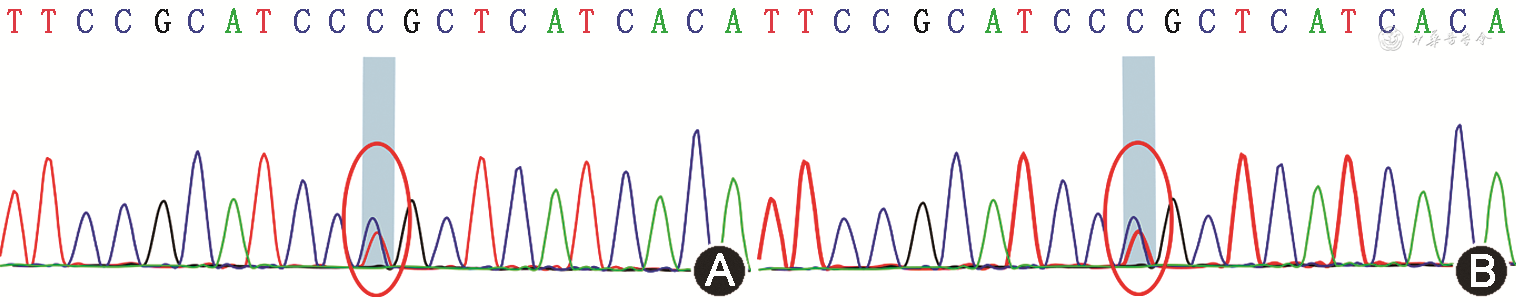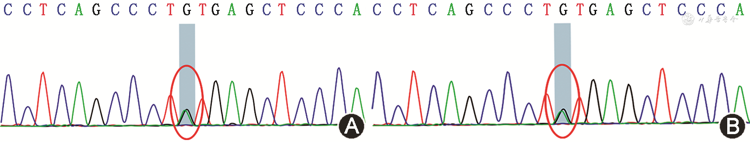 为明确诊断,经患者及家属书面知情同意,并经宁夏医科大学总医院伦理委员会批准(批号:KYLL-2023-0082)后,采集2例患者及其父母的外周全血标本,乙二胺四乙酸抗凝,进行全外显子测序。用全血基因组DNA 提取试剂盒(北京康为世纪生物科技有限公司,CWE 9600)提取DNA,用Illumina NovaSeq进行高通量测序,测序数据经Illumina Sequence Control Software(SCS)评估合格后,进行数据读取和生物信息学分析。后对突变位点行Sanger测序验证。检测结果:例1和例2存在NEU1 基因c.239C>T(p.P80L)和c.803A>G(p.Y268C)的复合杂合突变(图8,9),分别来自表型正常的父亲和母亲。患者之父NEU1基因c.803A>G位点存在一处杂合突变,患者之母NEU1基因c.239C>T位点存在一处杂合突变。NEU1基因为常染色体隐性遗传,患者存在单杂合突变的父母为携带者,理论上应不致病。