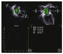 心脏是一个三维的结构,而左心房形态又极不规则,左心房在左心室收缩期储存肺静脉回流的血液,在左心室舒张早期充当肺静脉与左心室之间的管道,在左心室舒张晚期左心房主动收缩继续为左心室泵血。左心房利用上述的储存器功能、管道功能及助力泵功能有效做功来调节左心室充盈和维持正常心搏量。超声心动图作为一种评价左心房容积与功能的手段已经得到公认,而RT-3DE作为超声图像分析的新技术,可以实时动态观察心脏立体解剖结构,克服了传统二维超声对心腔显示及容积测量的局限性[2,3,4],更接近于CT和磁共振测值,真实地反映心动周期不同时相左心房容积与功能[5,6,7]。