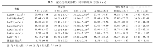 LAEDVI、LAESVI、LASVI、LApreI、LAVpI、LAVaI值在不同年龄组之间差异有统计学意义,A组与B、C组比较差异有统计学意义(均为P<0.05),B组与C组各参数高于A组,B组与C组之间差异有统计学意义(均为P<0.05)。LAEF′值在不同年龄组之间差异无统计学意义(P>0.05)(表5)。