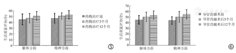 Reynolds等[12]针对多中心房颤导管消融和药物治疗后生活质量评分的研究表明,进行导管消融的患者较使用抗心律失常药物的患者无论在精神方面还是躯体方面,生活质量评分都明显升高,多因素分析结果表明,导管消融手术的实施和房颤是否复发是影响到生活质量评分的主要因素。Wokhlu等[13]的研究也同样证实,导管消融治疗可以明显改善症状性房颤患者的临床症状及生活质量。然而,在我们的研究中,在躯体方面,两种治疗手段均无明显改善,而导管消融治疗在精神方面得到了明显改善,这虽不能排除对于无明显症状的房颤患者,手术治疗存在精神安慰的可能性,从而影响了评价的客观性,但也可能与实验的设计、分组、纳入人群特征等综合因素相关,今后还需更加精细的设计及统计方法来对两种治疗手段对于生活质量的改善作出更加严谨客观的评价。