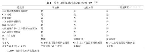 NOAC又称特异性靶点口服抗凝药(target specific oral anticoagulant,TSOAC),目前已经应用于临床的包括直接抗凝血因子Ⅱa抑制剂达比加群和直接抗凝血因子Ⅹa抑制剂利伐沙班及阿哌沙班。目前在我国市场上可用的NOAC仅有达比加群和利伐沙班,其药学特性见表3,常用口服抗凝药的适应证见表4。