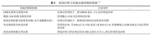 临床上常会遇到不同抗凝药物之间的转换问题。通常,NOAC和肝素类药物之间的转换比较简单,一般可在下一次用药时直接转换,不需要停药。华法林转换为NOAC时也较为简单,其方法是先停用华法林,待INR值降到目标值以下时直接加用NOAC即可。而从NOAC转换为华法林时则相对复杂,首先必须合用华法林和NOAC,待INR值达到目标值后再停用NOAC。需要注意的是,当NOAC转换为华法林时,由于NOAC对INR存在额外影响,因此INR的监测时间点尽可能取下一剂NOAC服用之前;在NOAC停用后24 h应再次复查INR;在NOAC停用1个月内应加强INR监测[22]。利伐沙班与其他抗凝药物的转换方法见表5,可供临床参考。此外,NOAC之间的转换目前尚缺乏研究。