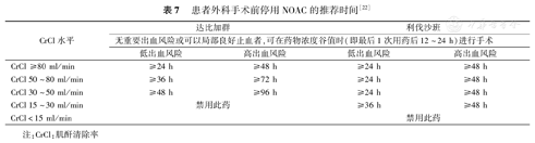 围术期止血工作组(GIHP)建议服用NOAC的患者在需要外科手术时采取下列处理原则,包括达比加群和利伐沙班(表6)[24]。由于肾功能状态会明显影响NOAC的清除半衰期,因此应根据患者的肾功能情况及手术的出血风险决定推迟手术的时间(表7)[22]。