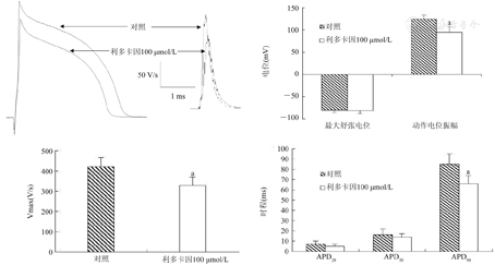 急性分离新西兰大白兔心脏,并予消化酶消化获得单个心室肌细胞,采用微电极技术检测AP相关参数:最大舒张期电位、零相最大上升速率(Vmax)、AP振幅,以及复极化20%、50%和90%时的AP时程(APD20、APD50、APD90)。采用全细胞膜片钳技术检测兔心室肌细胞的INa-T。用100 μmol/L利多卡因溶液灌流干预,观察各参数的变化。