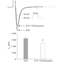 经100 μmol/L利多卡因灌流后,钠电流由(3 223±367)pA减低为(2 468±389)pA(P=0.003)(图2)。