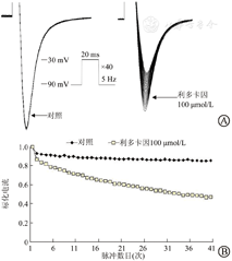 A:利多卡因对INa-T的影响电流图;B:INa-T随脉冲数目的变化图