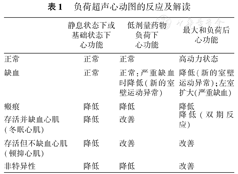 负荷超声心动图检查对于冠心病患者具有重要的诊断和预后意义。负荷超声心动图常用负荷方法包括运动负荷和药物负荷。负荷超声心动图的综合敏感性、特异性及预测值>80%。其中多巴酚丁胺负荷超声心动图是公认的检测存活心肌的方法之一。对比观察负荷超声心动图静息状态和负荷状态的室壁反应类型,可以推测相应的临床状况:①没有冠心病或可能性很小;②心肌缺血;③心肌梗死,没有存活心肌;④冬眠心肌、顿抑心肌等(表1)[1]。