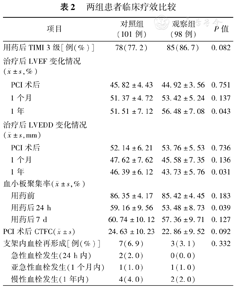 观察两组患者术后冠状动脉血流TIMI分级3级例数;治疗后第1个月﹑1年左心室射血分数(left ventricular ejection fraction,LVEF)和左心室舒张末期半径(left ventricular end diastolic dimension,LVEDD)变化情况;24 h、7 d血小板聚集率;PCI术后校正的TIMI帧数(corrected TIMI frame count,CTFC);PCI术后1年支架内血栓形成率。