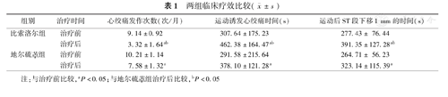 两组治疗前每月心绞痛发作次数、运动诱发心绞痛时间及运动后ST段下移≥1 mm所需时间比较差异无统计学意义(均为P>0.05),治疗后比索洛尔组较地尔硫
