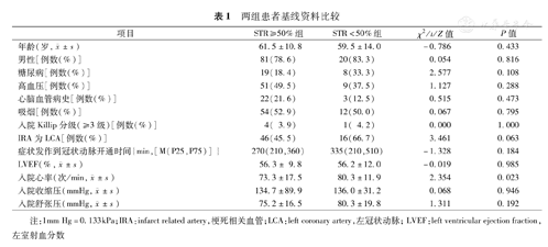由两位以上心内科医师分析术前及术后即刻(15~30 min)的心电图,选取术前ST段抬高幅度最高的导联,计算心电图ST段回落率(ST segment resolution,STR)。计算公式:STR率=(术前ST段抬高幅度-术后即刻ST段抬高幅度)/术前ST段抬高幅度×100%。STR率≥50%为ST段完全回落,STR率<50%为ST段回落不良。