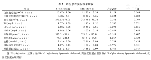 | 项目 | STR≥50%组 | STR<50%组 | χ2/t/Z值 | P值 |