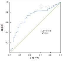 以心功能正常与否,绘制CA125的ROC曲线,提示AUC为0.754(P<0.01),最佳临界值为21.985(敏感度:74%,特异度:66%),见图1。