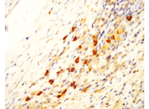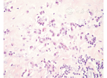 患者男性,47岁,因"腹胀20余天,胸闷、憋气15天"入院。患者入院前20余天无明显诱因出现腹胀,进行性加重,偶伴恶心、呕吐。15 d前出现胸闷、憋气,多于活动后出现,休息后可缓解,同期出现尿量减少、双下肢水肿。7 d前突发憋喘加重,伴大汗,休息后缓解。症状出现后患者饮食差,体重在20 d内增加5 kg,体力明显下降,平地步行200 m即感喘憋。期间予强心、利尿、对症治疗,效果不明显。既往体健。查体:体温36.5℃,脉搏140次/min,呼吸18次/min,血压141/101 mmHg。巩膜轻度黄染,双下肺呼吸音减低,无明显干湿啰音,心律齐,心率140次/min,心音略低,各瓣膜区未闻及明显杂音,腹部膨隆,触诊不满意,叩诊实音,肠鸣音未及,双下肢对称性水肿,达膝上1 cm。实验室检查:白细胞6.6×109/L,血红蛋白121 g/L,血小板258×109/L,总胆红素22.8 μmol/L,直接胆红素10.8 μmol/L,谷草转氨酶32 U/L,谷丙转氨酶22 U/L,肌酐66 μmol/L,血沉7 mm/第1小时,C反应蛋白1.1 mg/dl,转铁蛋白184 mg/dl,补体C3 112 mg/dl,补体C4 21 mg/dl,免疫球蛋白G 1 490 mg/dl,免疫球蛋白M 321 mg/dl,免疫球蛋白A 317 mg/dl,免疫球蛋白G1 10.6 g/L,免疫球蛋白G2 3.85 g/L,免疫球蛋白G3 0.416 g/L,免疫球蛋白G4 0.668 g/L,NT-proBNP 1 137 pg/ml,结核抗体实验(-),PPD试验(-)。心电图提示心房扑动,心室率140次/min,V2~V5导联ST段压低;超声心动图提示左心房扩大,室壁运动普遍减低,左心室射血分数46%,室间隔处二尖瓣环e′值12 cm/s,侧壁处二尖瓣环e′值8.46 cm/s。胸部CT提示心包不均匀增厚伴钙化,双侧胸腔积液,双下肺膨胀不全,两侧胸壁软组织水肿(图1),腹部超声提示肝大,肝中静脉和下腔静脉增宽,符合肝淤血表现,少量腹腔积液。入院后诊断缩窄性心包炎,于全麻下行心包剥脱术。病理提示心包明显增厚,有多量浆细胞、淋巴细胞浸润,有淋巴滤泡形成,纤维组织增生伴玻璃样变性,可见纤维素渗出,免疫组化结果:CD138(浆细胞+),CD38(浆细胞+),IgG1(+),IgG2(+),IgG3(+),IgG4(>20/HPF),CD20(B细胞+),CD3(T细胞+),CD4(T细胞++),特殊染色结果:弹力(+),诊断为IgG4相关性缩窄性心包炎(图2、图3)。术后患者心律转为窦性,症状明显改善,嘱患者出院后继续糖皮质激素治疗,但患者未服用激素治疗。