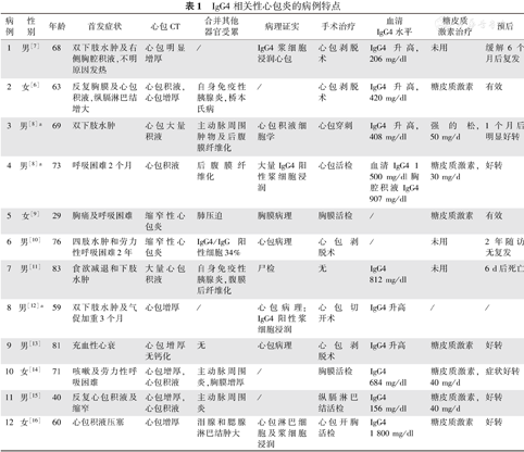 目前研究发现,IgG4-RD可累及多个器官,但心包炎作为本病的罕见类型较少报道。本病例中,患者术前临床诊断为缩窄性心包炎,但既往无结核病史,血清结核抗体及PPD试验均阴性,没有足够的理检查结果诊断为IgG4相关性缩窄性心包炎,在行心包剥脱术后临床症状明显好转,未发现其他器官或腺体受累,未给予激素治疗,随访2年未发现新的症状,无其他脏器受累。我们复习了Pubmed中的IgG4相关性心包炎的个案报道,见表1。