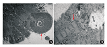 A:×35 000;B:×20 000;细胞间纤维增生,心肌闰盘退行性变(B中箭头所示),部分电镜下结构消失;部分细胞核碎裂,呈退行性变,部分心肌细胞内糖原堆积(A中箭头所示)