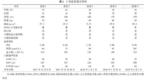 5例患者中男性3例,女性2例,年龄28~62岁,平均42岁,平均BMI 28.8 kg/m2。所有患者术前应用抗血小板药物治疗,均未应用口服抗凝药物,INR均在正常范围。有1例为慢性肾功能不全并规律肾脏替代治疗的患者,血肌酐307 μmol/L,其他患者血肌酐均在正常范围。血小板134~314×109/L,中位数为204×109/L。NYHA心功能分级Ⅲ~Ⅳ级,LVEF 20%~38%,中位数为29%。患者均存在心脏扩大,EDV 167~354 ml,中位数298 ml,LVEDD 58~81 ml,中位数66 mm(表1)。