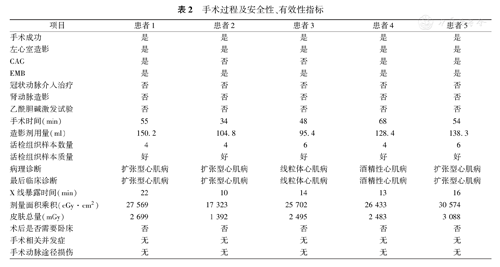 5例患者中,男性3例,女性2例,年龄28~62岁,平均42岁,平均体质指数28.8 kg/m2,根据临床适应证,行左心室造影、冠状动脉造影及经桡动脉左心室EMB等操作。手术成功率100%,有3例冠状动脉造影及左心室造影后即刻经同一桡动脉途径行EMB,其他2例先行冠状动脉造影,数天后行经桡动脉途径EMB。手术时间34~68 min,中位时间54 min。造影剂用量95.4~150.2 ml,平均123.4 ml。心肌活检组织样本数量4~6块,平均4.4块,质量好,心肌活检组织病理诊断率100%。X线暴露时间10~22 min,平均15.3 min。X线暴露剂量:剂量面积乘积17 323~30 574 cGy·cm2,中位数为26 433 cGy·cm2,皮肤总量1 392~3 088 mGy,中位数为2 495 mGy。所有患者术后无需卧床,无手术相关并发症。