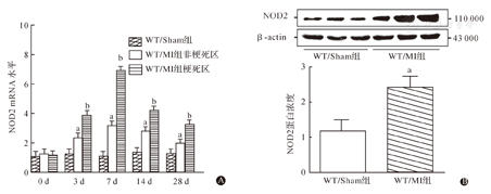 结扎小鼠冠状动脉左前降支建立MI模型。实时荧光定量PCR检测不同梗死时间假手术组、手术组梗死区、手术组非梗死区NOD2的mRNA表达水平,免疫组化染色和Western blot测定梗死28 d心肌组织NOD2的蛋白表达。采用NOD2-/-基因敲除小鼠建立MI模型,实验分为4组:野生/假手术组(WT/Sham组)、NOD2基因敲除/假手术组(NOD2-/-/Sham组)、野生/MI组(WT/MI组)和NOD2基因敲除/MI(NOD2-/-/MI组)。小动物超声心动图测定心室重构指数并判断心功能,Masson和Tunel染色观察小鼠心梗后心肌纤维化程度及细胞凋亡情况,酶联免疫吸附法(ELISA)测定梗死心肌组织的促炎细胞因子水平,Western blot和明胶酶谱法检测心肌组织裂解液基质金属蛋白酶9(MMP-9)蛋白及活性变化,并用免疫组化染色观察MI后炎性细胞浸润和心脏成纤维细胞转分化成心肌成纤维细胞情况。