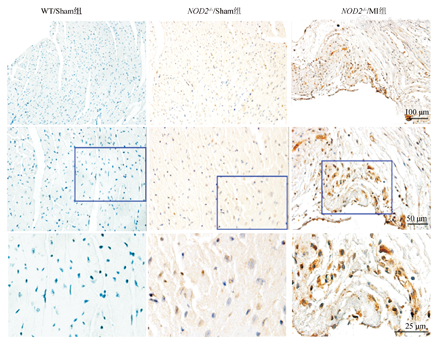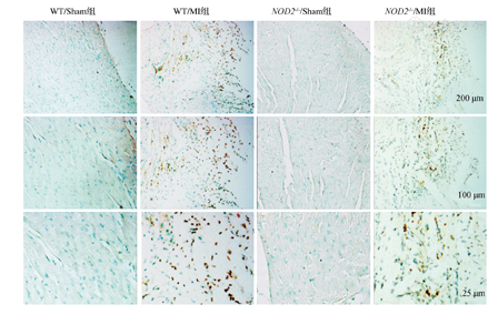 在MI的0、3、7、14和28 d分别收集梗死区和非梗死区的心肌组织,通过qPCR检测NOD2 mRNA表达。如图1A,与WT/Sham组相比,WT/MI组非梗死区和梗死区NOD2 mRNA表达水平明显升高(均为P<0.05),其中梗死区NOD2的mRNA表达变化水平最高,且呈时效性变化,在MI第7天达到顶峰,28 d后回落,但与WT/Sham组比较仍有显著性差异(均为P<0.05)。取MI 28 d的梗死组织测NOD2蛋白浓度,与WT/Sham组相比,WT/MI组的NOD2浓度显著升高(图1B);免疫组化结果也证实MI 28 d后,NOD2表达仍增强(P<0.05)(图2)。