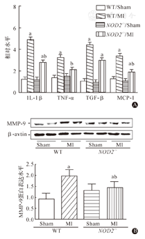 NOD2通过调控MMP-9蛋白及活性、炎性介质水平和炎性细胞浸润来介导MI后心室重构过程。