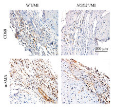 采用免疫组化法检测心肌组织梗死区域NOD2、CD68、α-SMA的表达。