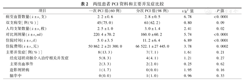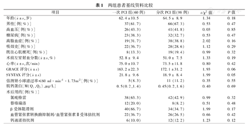 | 项目 | 一次PCI组(60例) | 分次PCI组(98例) | t/χ2值 | P值 | |