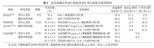 | WOEST[26] | 多中心非盲 | 573 | 70.3 | OAC+氯吡格雷(279例) | 19.4 | 11.1 | 2.5 |
