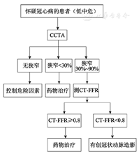 目前来看,CT-FFR最适用于低中危患者的冠心病评估:对可疑冠心病先行CCTA,然后测定狭窄>30%病变的CT-FFR,根据CT-FFR值决定是否进一步行有创冠状动脉造影。图1为推荐的CT-FFR临床工作流程。如前所述,CT-FFR较单纯CCTA特异性提高,降低了假阳性率,避免了不必要的有创冠状动脉造影。