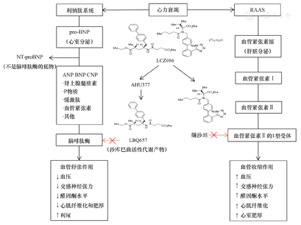 pro-BNP:B型利钠肽原;NT-proBNP:N末端B型利钠肽原;ANP:心房利钠肽;BNP:B型利钠肽;CNP:C型利钠肽;LCZ696:沙库巴曲/缬沙坦;AHU377:沙库巴曲;RAAS:肾素-血管紧张素-醛固酮系统