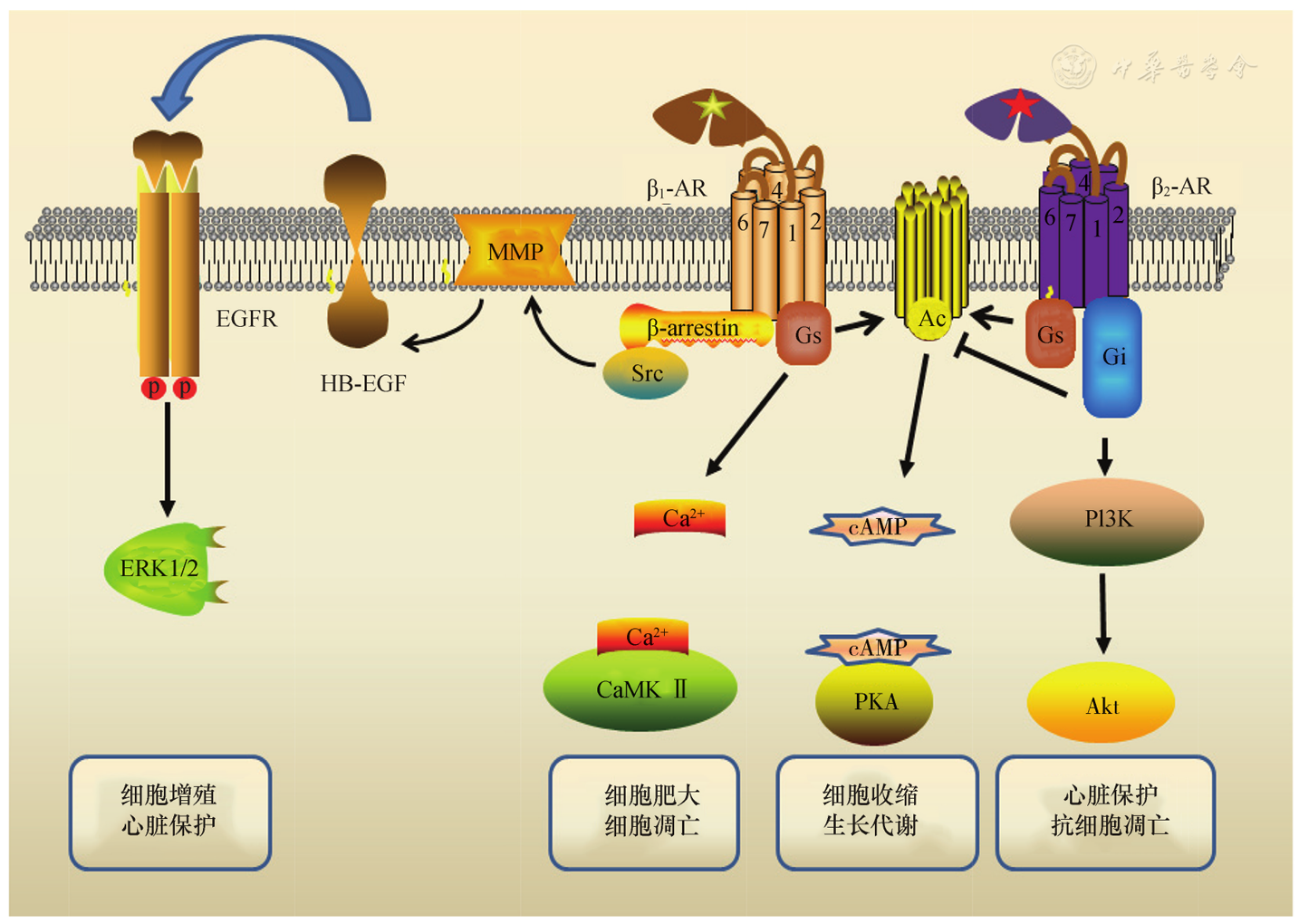 β-AR:β肾上腺素受体;MMP:基质金属蛋白酶;HB-EGF:肝素结合表皮生长因子;ERK:细胞外调节蛋白激酶;EGFR:表皮生长因子受体;CaMK:钙调节蛋白依赖性蛋白激酶;CAMP:环磷酸腺苷;PKA:蛋白激酶;PI3K:磷脂酰肌醇3激酶;Akt:蛋白激酶B