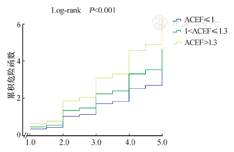 ±s表示;非正态分布的计量资料用M(Q1,Q3)表示。计数资料用百分构成比表示。采用倾向性评分匹配的方法对患者的临床基线资料进行匹配,采用决策树算法计算ACEF评分的最佳截止值。两组间比较采用卡方检验及Mann-Whitney U检验,多组间比较采用Kruskal-Wallis检验,采用Kaplan-Meier生存分析法估计不同ACEF评分的ACS患者PCI术后6个月内再次接受PCI血运重建的累积发生率,并使用对数秩检验进行比较。P<0.05为差异有统计学意义。