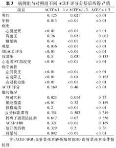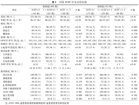 在不同ACEF评分分层中,病例组患者更年轻、有心肌梗死病史的更多、吸烟的更多、GRACE评分更高、心电图ST段改变者更多。在ACEF≤1分层中,病例组患者服用阿司匹林、氯吡格雷的患者较少;在1<ACEF≤1.3分层中,病例组患者的高血压比例较高,服用阿司匹林的患者较少;在1<ACEF≤1.3和ACEF>1.3组中,病例组患者的糖尿病比例较高。见表2、表3。