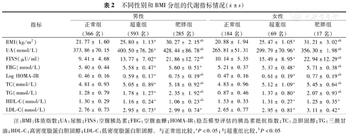 不同性别和BMI分组的代谢指标情况见表2。其中,HDL-C随BMI的增加而降低,尿酸、FBG、FINS、TC、TG、LDL-C和HOMA-IR随BMI的增加而增加。