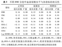 本研究中相关分析发现,在不同BMI分组中,尿酸与BMI、TG、HOMA-IR和FINS均呈显著正相关。尿酸与HOMA-IR的相关性在肥胖组最大。结果与Salazar等[7]的研究一致,表明尿酸与BMI、胰岛素抵抗及血脂代谢密切相关。