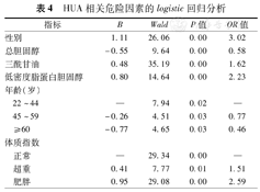 以HUA为因变量(是=1,否=0),FBG、FINS、TC、TG、HDL-C、LDL-C、HOMA-IR和性别(男=1,女=0)进行多因素logistic回归分析,其中BMI、年龄(22~44岁、45~59岁、≥60岁)按照分组为类别变量,分析方法采用前向LR法。分析发现,男性(OR=3.02)、超重和肥胖(OR=1.51和2.59)、TG升高(OR=1.62)、LDL-C升高(OR=2.23)是HUA的独立危险因素。相对于年龄22~44岁组,年龄45~59岁组和≥60岁组的OR值分别为0.77和0.46,显示年龄增长是HUA的保护因素,见表4。