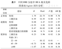不同BMI分组中HUA相关危险因素的logistic回归分析